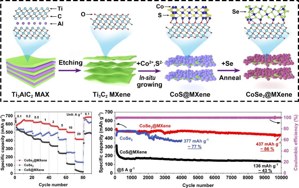 图CoSe2@MXene复合材料的合成示意图和电化学性能图