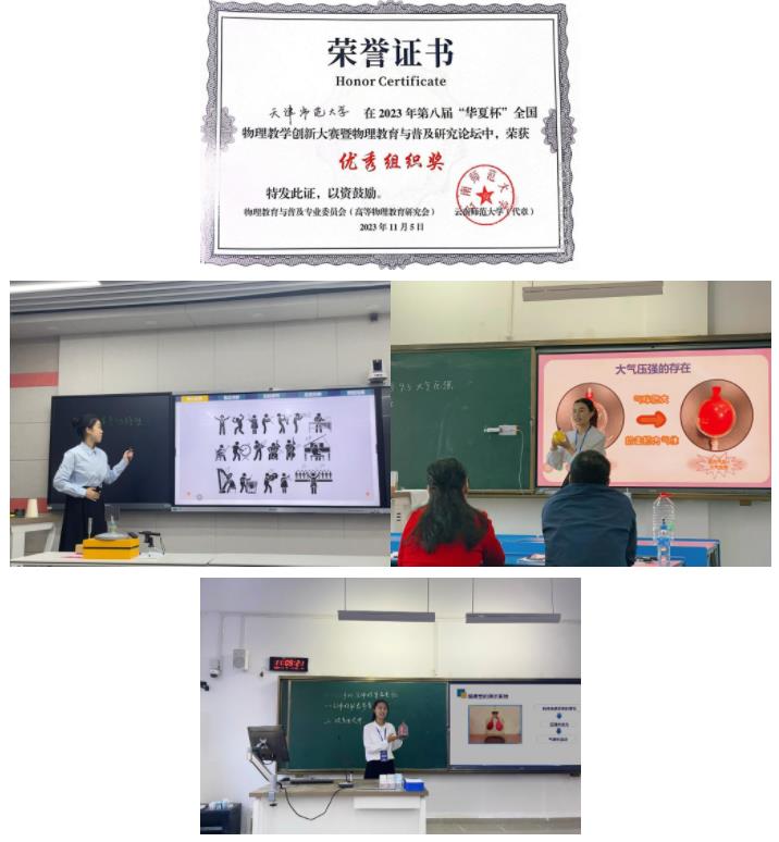 近日,第八届“华夏杯”全国物理教学创新大赛暨物理教育与普及研究论坛在云南师范大学举行。经过紧张激烈的比赛,beat365亚洲版官网2021级物理师范生施芷妍、刘睿祺、李雅杰表现出色,均斩获一等奖。其中,施芷妍同时获得“实验创新奖”,并获推参与创新教学大赛优秀作品展示。beat365官网荣获“优秀组织奖”。