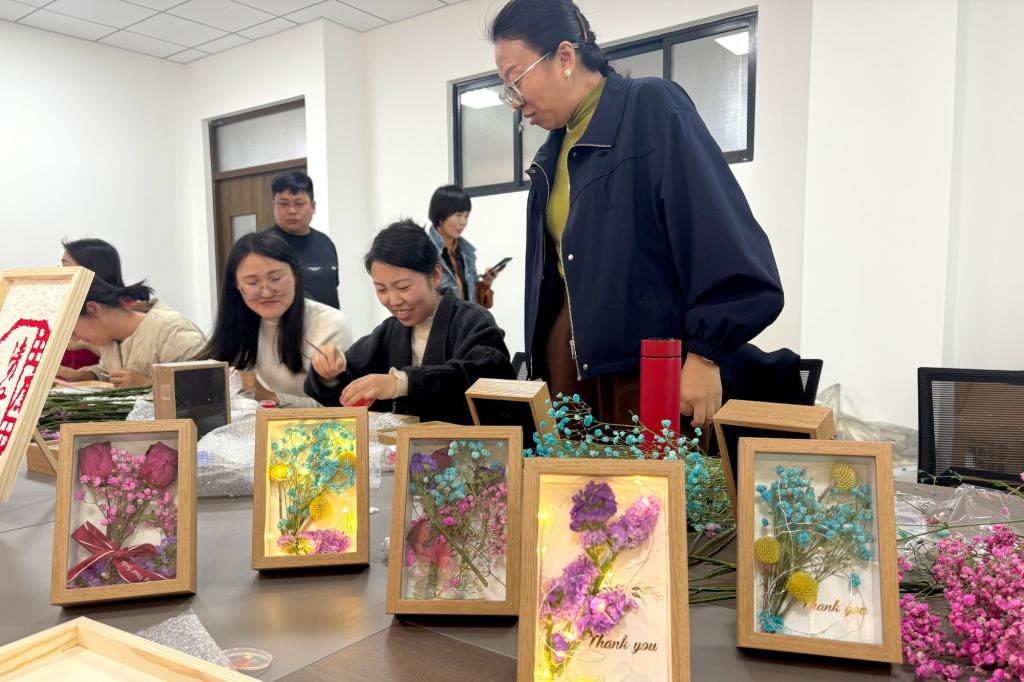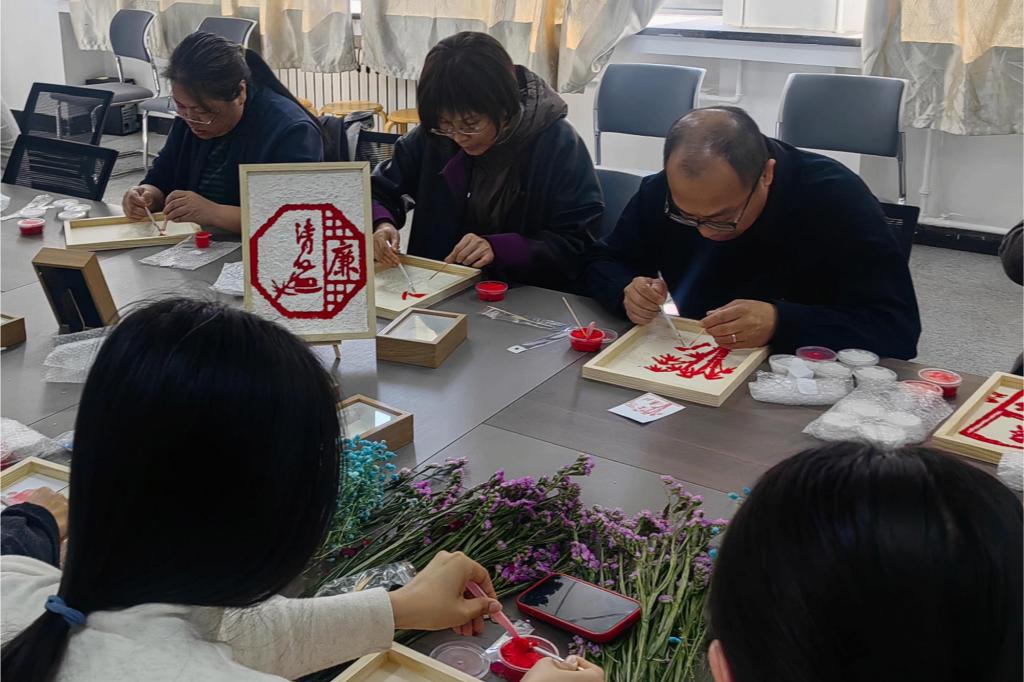 学院领导班子与女教师代表一同参与到“纸浆画”“干花画”的制作中,一派热火朝天的景象。活动现场老师们以永生花为材,松枝为骨,在素色画框中精心构图,将“廉洁”主题融入自然之美;以镊子沾染朱红纸浆轻轻点缀,鲜红明亮的“清廉”“廉政”跃然纸上,为打造风清气正的校园环境注入了“她力量”。莲花、翠竹等廉洁元素代表着高风亮节,刚正不阿,既深入人心又富含警示意味,寓意全体领导干部及教职工人员要坚守着为党育人,为国育才的初心。